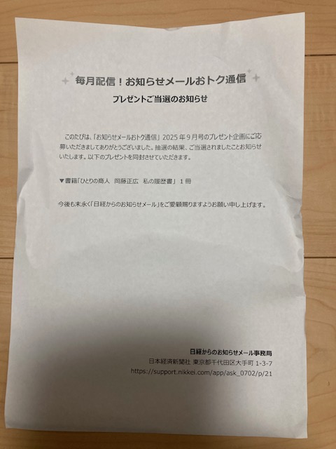 伊藤忠商事の会長さんの自叙伝ですが読んでみたくてなんとなく申し込んだんでした。すっかり忘れていたのですが、当たることもあるんですね(笑)