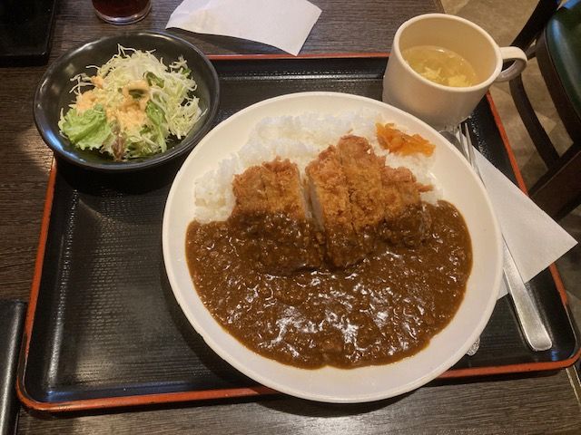 カツカレー(サラダ、スープ、フリードリンク付き、1000円)。