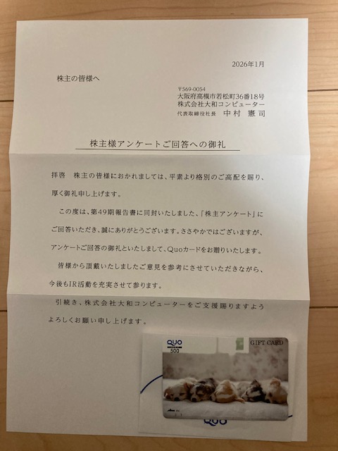 大和コンピュータさんから株主アンケートの回答のお礼ということでQUOカードが届いていました。