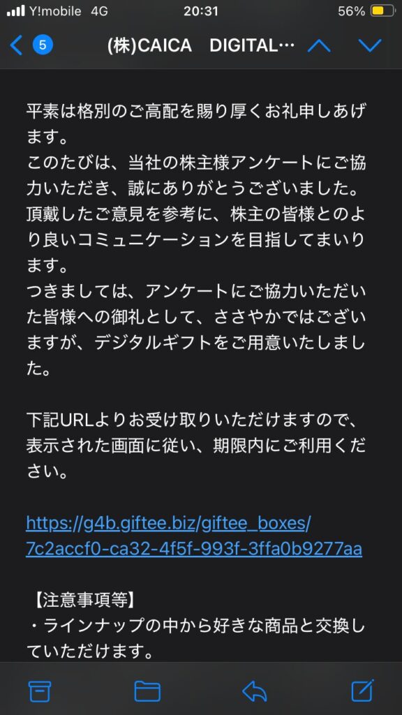CAICA DIGITALさんから株主アンケートのお礼が届いていました。