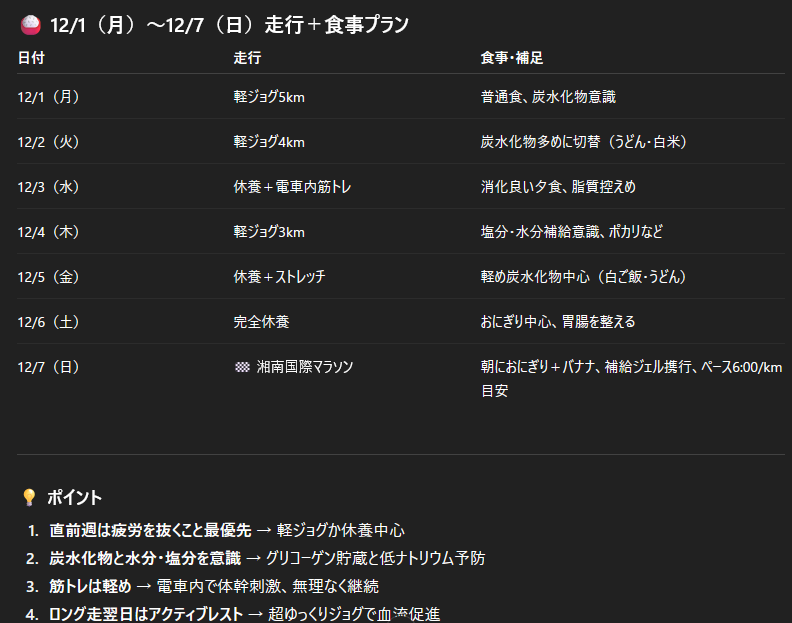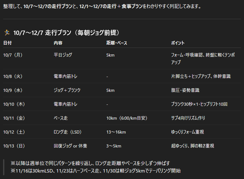昨日ハーフマラソン大会にでた話を書いたんですが、それをChatGPTに教えて、具体的なトレーニングメニューを考えてもらいました。